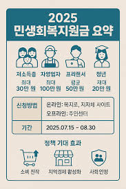 | 기본 지급 (1차) | 모든 국민 1인당 15만원 | 2025년 7월 21일 ~ 9월 12일 신청 | 내수 활성화 및 보편적 지원의 기본 틀. 모든 국민이 받을 수 있는 최소 금액. |